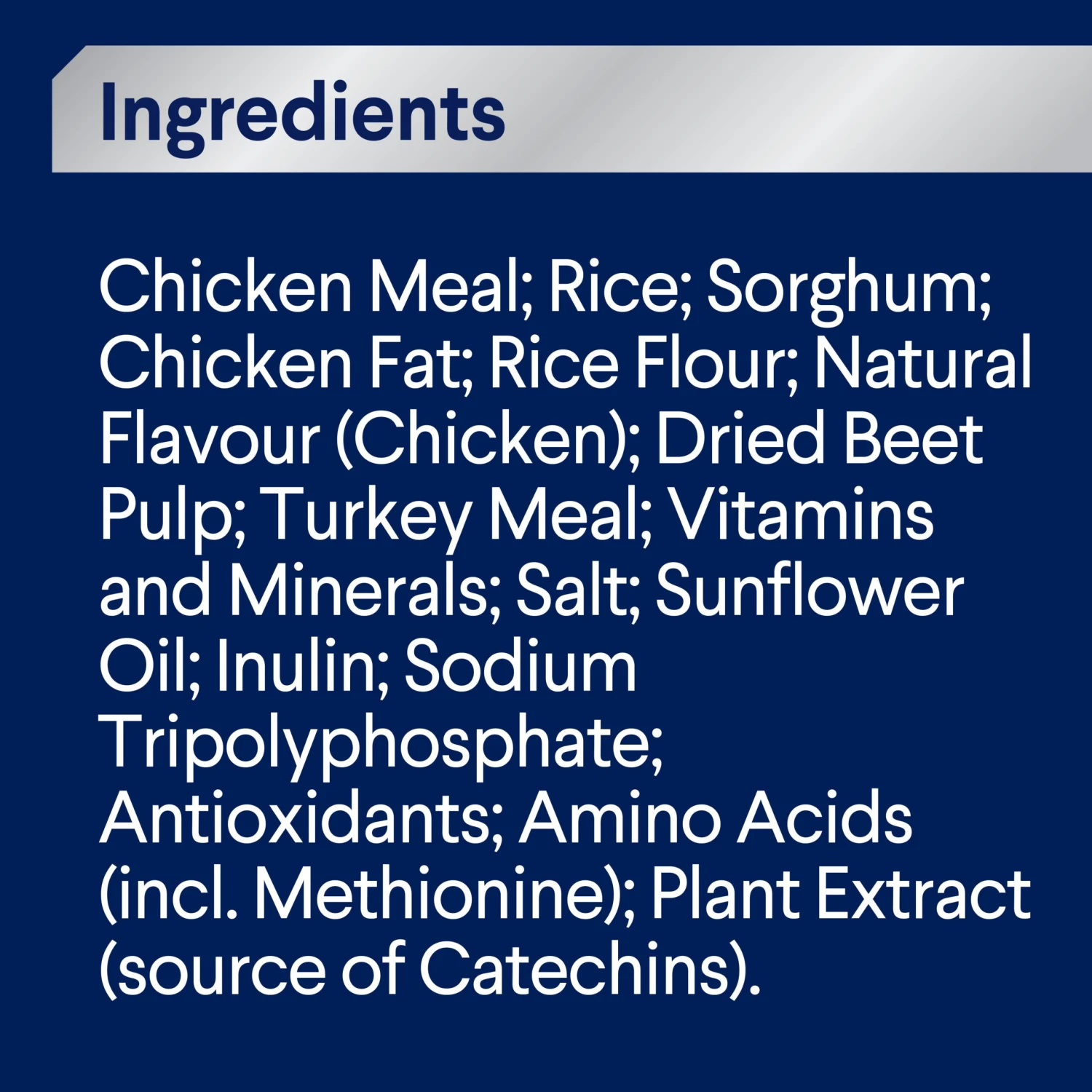 Packed with premium-grade chicken, vitamins, antioxidants, green tea and sodium tripolyphosphate, this dry dog food is free from artificial additives and is tailored to support oral and dental health.