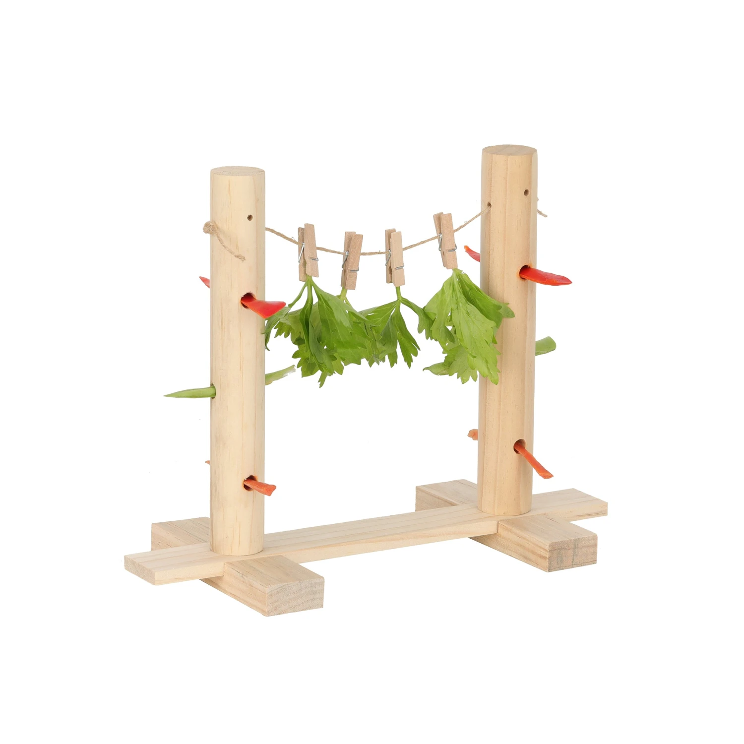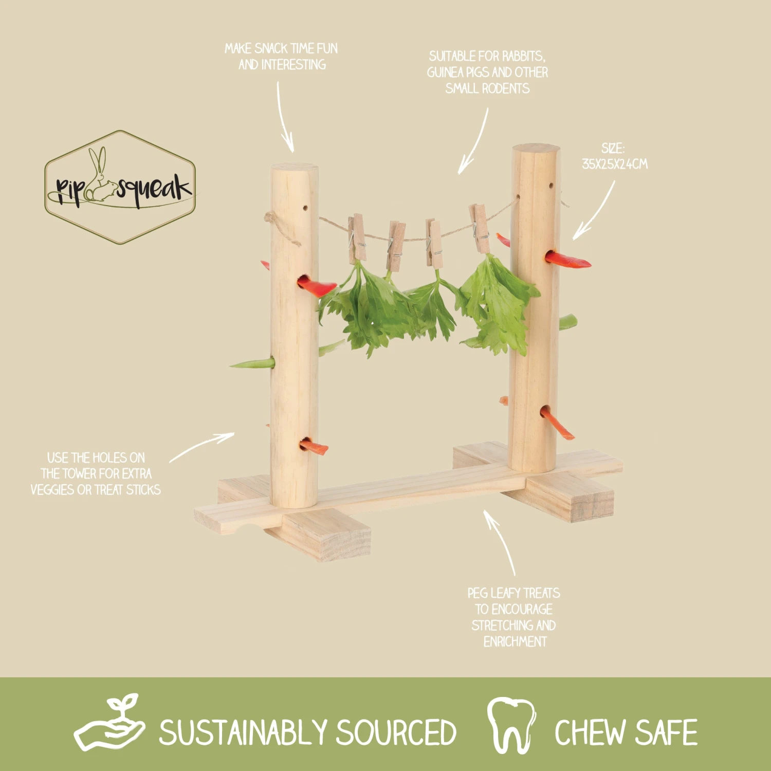 The Pipsqueak Stretch & Snack Line encourages your small pet to forage for food, satisfying natural instincts and providing mental stimulation. Made from natural, chew-friendly wood, attach greens and treats to the line with pegs to encourage your small pet to stretch for their food, with additional holes on the posts for veggie sticks. Suitable for Rabbits, Guinea Pigs, Mice and other small rodents.