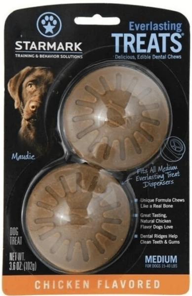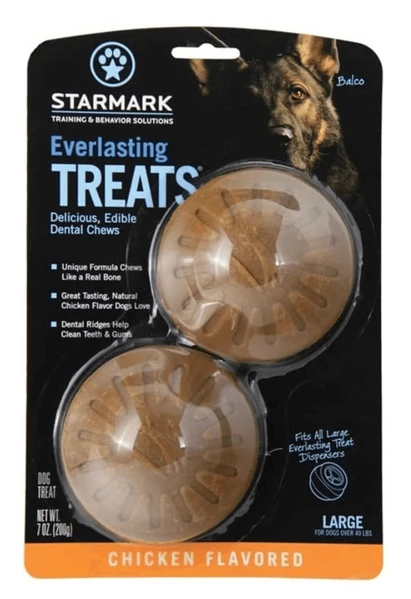 Starmark everlasting treats are long-lasting dental chews that are hard like a bone to help keep your dog’s teeth clean. Starmark Treats are made from natural ingredients without plastics or polymers and are edible and digestible with an irresistible taste. These treats can be eaten as a snack or use inside the Starmark mental stimulation toys to create hours of mental and physical stimulation.